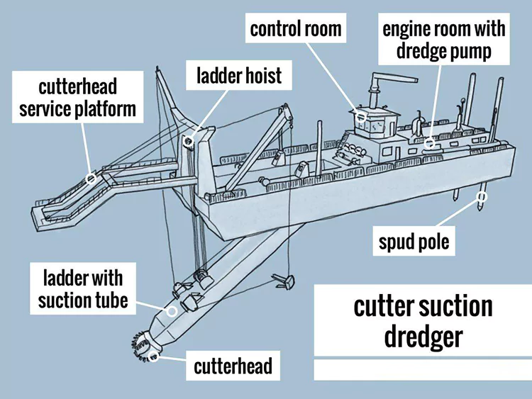 Его основные конструкции включают режущую систему, систему всасывания и разгрузки, систему позиционирования и перемещения, а также систему питания, обеспечивающую интегрированные операции «экскавация-транспортировка-разгрузка». Он широко используется в проектах по дноуглублению и мелиорации рек.。